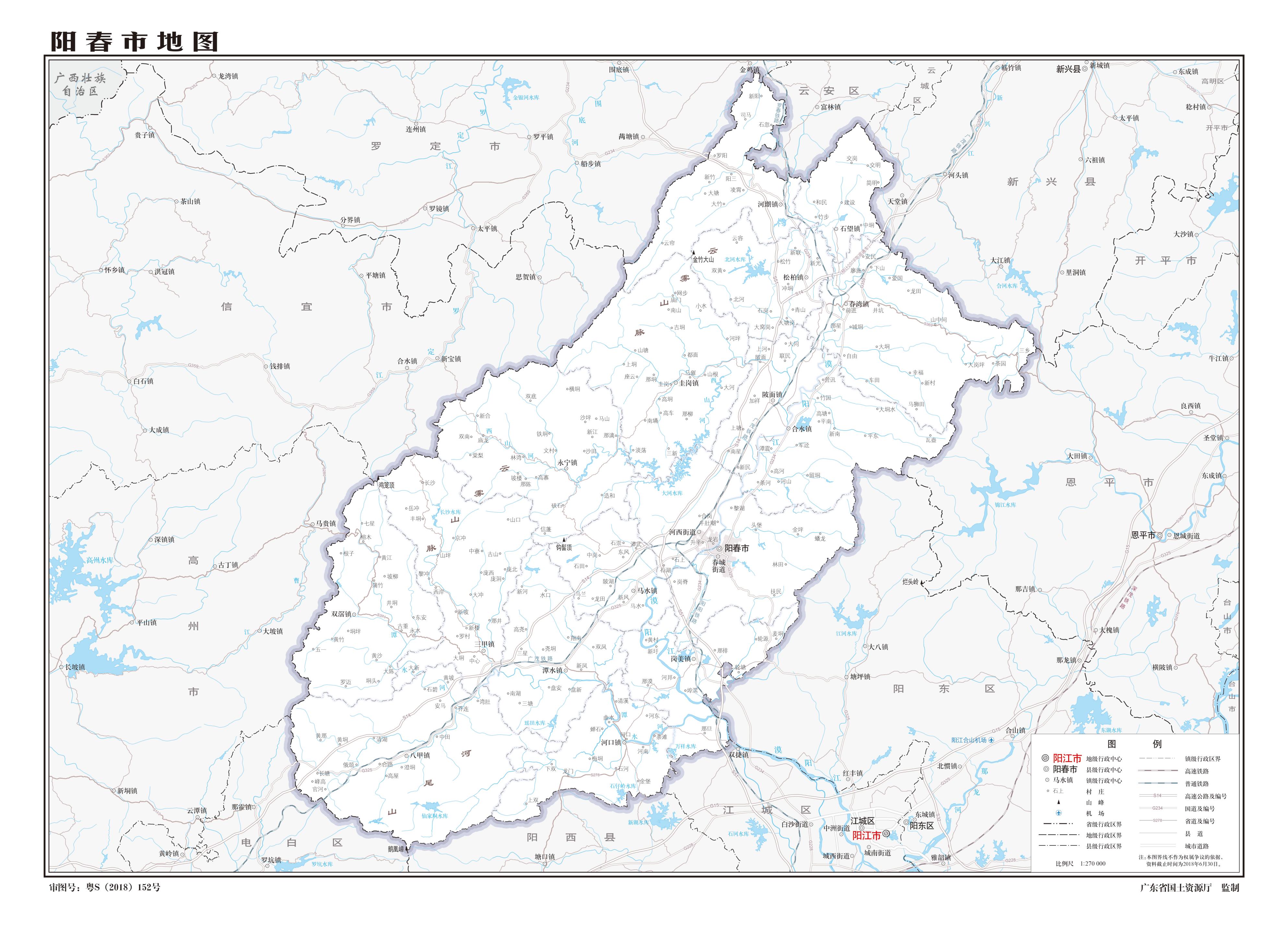 位置境域 陽春市位于廣東省西南部,地處云霧山脈、天露山脈中 段與河尾山的八甲大山之間,漠陽江中上游。地理坐標為北緯21°50′36″~22°41′01″,東經111°16′27″~112°09′22″。東與恩平市相接,南與陽東區(qū)、江城區(qū)、陽西縣、電白縣相連,西與高州市、信宜市接壤,北與羅定市、云安縣、新興縣為鄰。全市總面積4037.8平方公里。南北長104公里,東西寬91公里。