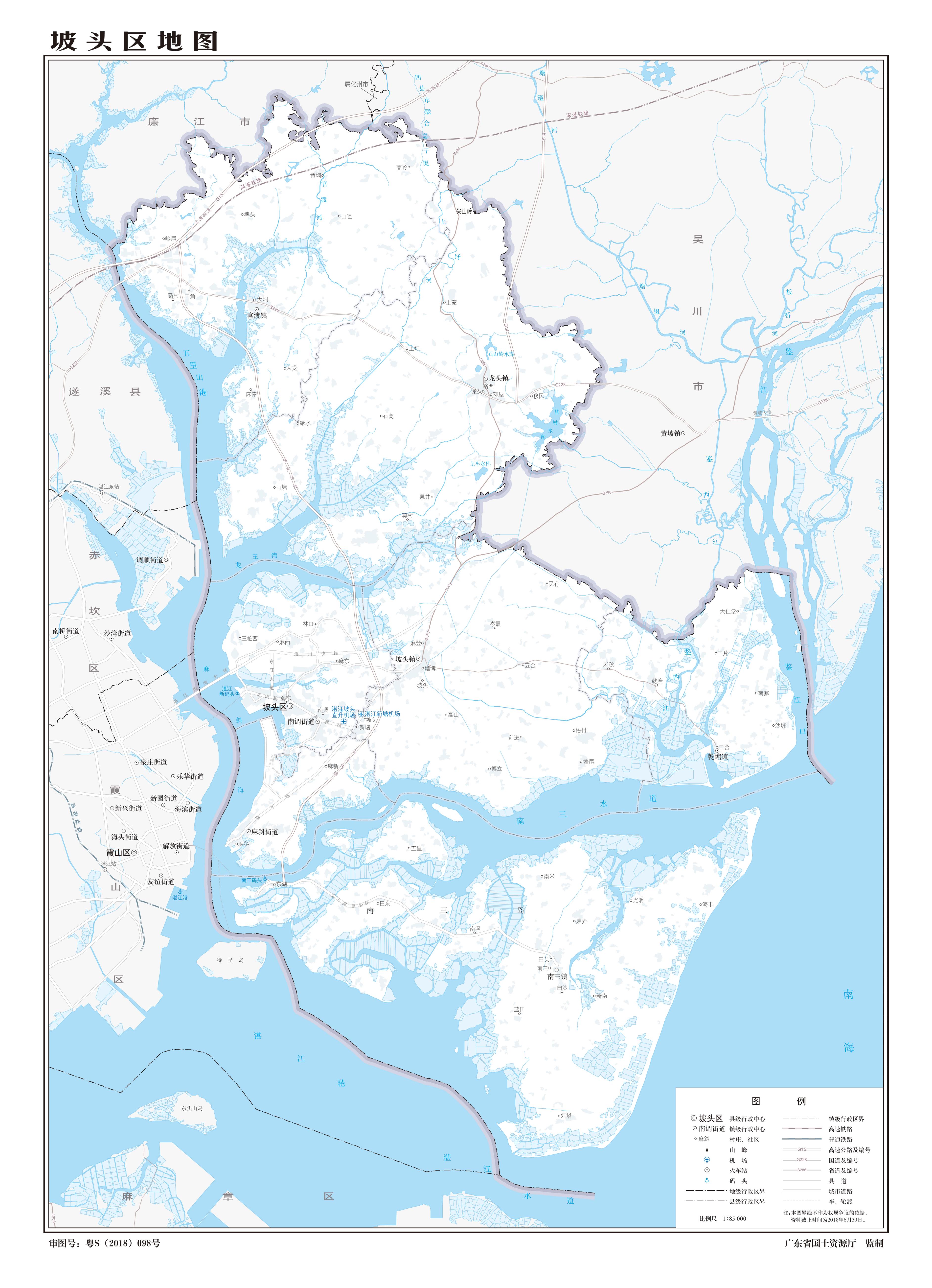 位置境域 湛江市坡頭區(qū)位于廣東省西南部,雷州半島東北部,湛江海灣東岸,地跨東經(jīng)109°20'~110°18',北緯21°5'~21°26'。東接吳川市,南臨南海,西是湛江港灣,與赤坎區(qū)、霞山區(qū)、湛江經(jīng)濟(jì)技術(shù)開發(fā)區(qū)以及遂溪縣隔海相望,北連廉江市。坡頭區(qū)東西最大橫距20.6公里,南北最大縱距40公里,陸地總面積613平方公里,海岸線長192公里。