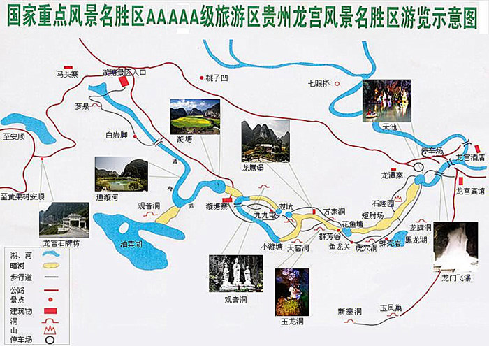 景區(qū)以溶洞、洞穴、瀑布為主體,堪稱黔中一絕,包括龍宮、油菜湖、漩塘、螞蟥四大片區(qū)。龍宮中心區(qū)有臥龍湖、迎賓洞、龍門飛瀑、龍?zhí)短斐、龍宮暗湖、蚌殼巖、虎穴洞等景點(diǎn)組成,上下輝映,別有洞天,宛如神話中龍王所居的水晶宮殿。天池是一個(gè)山間湖泊,澄綠如玉,俗稱龍?zhí)叮聻a,從巨大的溶洞跌拓而下,水墻壁立,寬25米,高約50米,驚濤奔涌,蔚為壯觀,此即龍門,據(jù)稱為中國(guó)地下瀑布之冠。這里有五段串珠式的暗洞、湖溶洞型地下河,五進(jìn)五出,稱為五進(jìn)龍宮,全長(zhǎng)15公里,造型非常奇特,是中國(guó)發(fā)現(xiàn)的,最長(zhǎng)的水上巖溶。