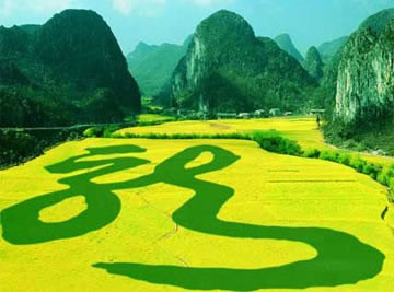 在龍宮漩塘景區(qū)通漩河左岸的田地里,春季采用的是油菜花和蠶豆套種,秋季采用普通水稻和黑糯米水稻套種,占地面積120畝,折合約8萬(wàn)余平方米的“龍”字景觀是從2009年2月下旬起,貴州(龍宮)第七屆油菜花旅游節(jié)期間開始推出的。