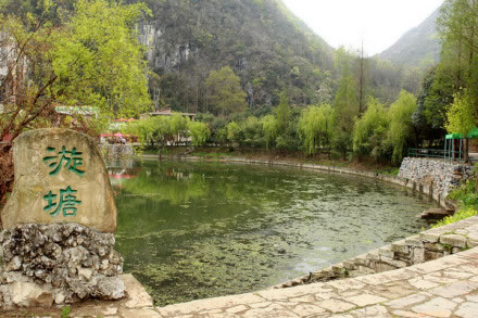 漩塘是國(guó)家級(jí)風(fēng)景名勝區(qū),在龍宮的上游。一個(gè)面積達(dá)萬(wàn)余平方米的圓塘,池水不借風(fēng)力,日日夜夜、年年歲歲永不停歇地沿著順時(shí)針?lè)较蛐D(zhuǎn)著。景象珍奇,令游客陶醉。通漩河的水流到這里便沉入地下,變?yōu)榈叵掳岛。塘面呈圓形,一年四季塘水以順時(shí)針?lè)较颍瑨稁暇G色浮萍不停地漩轉(zhuǎn),終年不息。