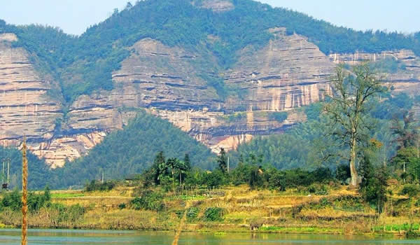 銅梁山位于湘潭縣石鼓鎮(zhèn)境內(nèi),山脈海拔700多米,地勢極為偏僻,正好處于湘潭縣與雙峰縣的交界之處。銅梁山名稱由來還有個美麗的傳說。在雙峰縣井字鎮(zhèn)與湘潭縣、湘鄉(xiāng)市交界處,有一座大山叫昌山。主峰靈應(yīng)峰海拔755.1米,是南岳72峰之一。在主峰與鷹尖石之間,橫臥著一條長達2公里的一字形平脊嶺,當?shù)厝私兴?ldquo;一字大脊”。相傳有一仙人挑著兩個大小不一的籮筐,掌燈時分就來到了大山腳下的花山村。熱情好客的花山人見了這位外來客人,格外歡喜,他們以美酒佳肴相陪,不知不覺已到雞鳴。仙人突然想起師父“雞鳴前一定要翻過大山”的教誨,趲告辭,挑起擔子飛也似的上山去?墒牵涂偷幕ㄉ饺艘粫䞍罕惆l(fā)現(xiàn),那人的擔子擱在了山頂,扁擔成了一條“一字脊”,兩個籮筐便成了一字脊兩端的“巒柱”,形似一個巨大的銅梁。因此,銅梁山這個美名便叫開了。
