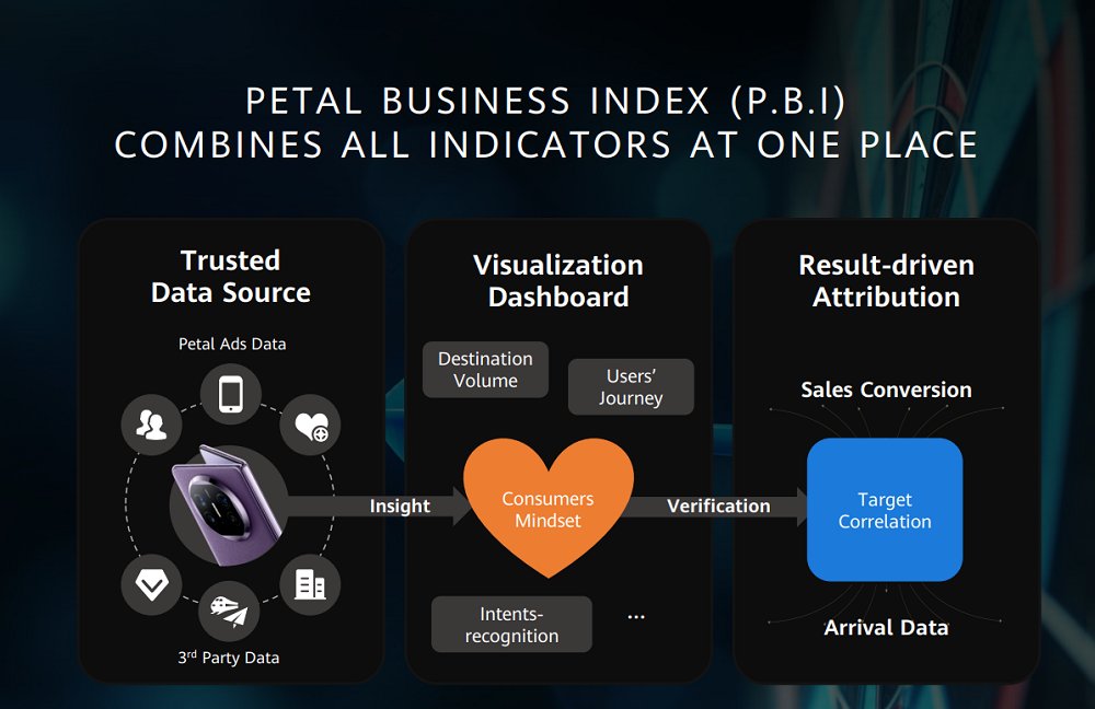 借助華為的技術(shù)和生態(tài)系統(tǒng)合作伙伴,鯨鴻動能還構(gòu)建了Petal Business Index(P.B.I)跨境數(shù)據(jù)驅(qū)動解決方案,以滿足更多企業(yè)組織的需求。作為以數(shù)據(jù)驅(qū)動的營銷工具,P.B.I整合了來自華為設(shè)備和鴻蒙生態(tài)的全方位數(shù)據(jù),并與第三方在線旅游服務(wù)平臺等行業(yè)伙伴合作,共同構(gòu)建了一個可信賴的數(shù)據(jù)模型,并圍繞目的地的關(guān)鍵指標(biāo)建立可視化的儀表板。P.B.I通過建立銷售轉(zhuǎn)化與落地數(shù)據(jù)之間的相關(guān)模型,進行有效性分析,輔助營銷策略的制定。