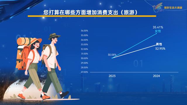 旅游大軍中,女性的出游意愿高漲。準備今年在旅游方面增加消費的女性占比較去年增加了5個百分點,也比男性高出2個百分點以上,是2024年旅游消費妥妥的“主力軍”。