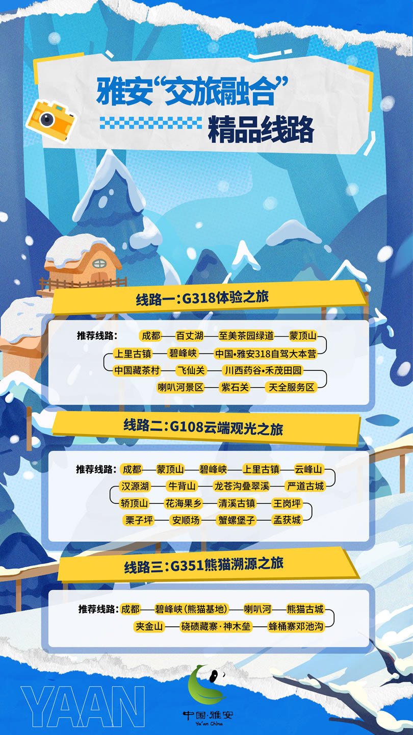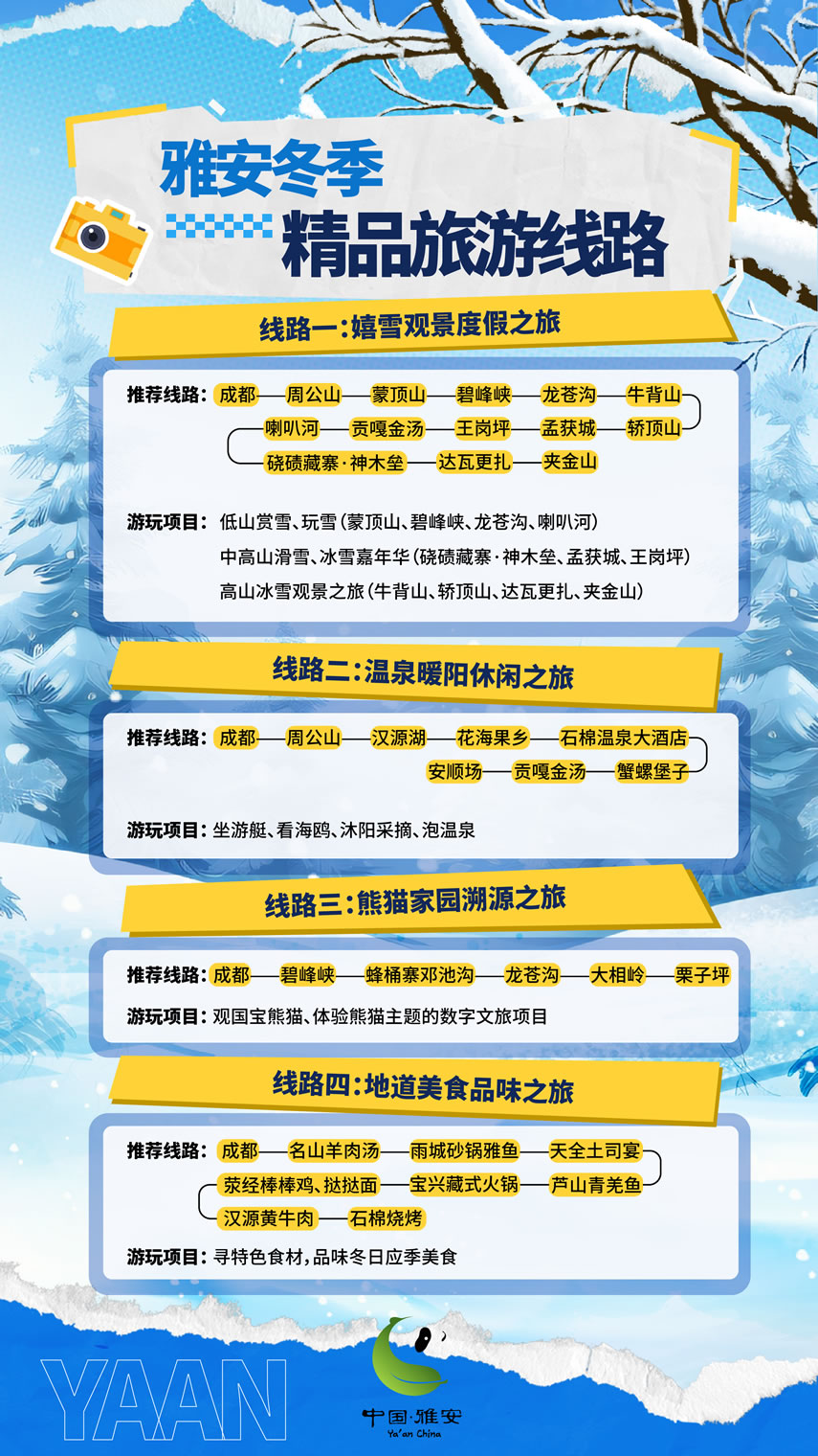 這個(gè)冬天,雅安市圍繞冰雪、溫泉、熊貓、美食,推出4條冬季精品旅游線路,圍繞國(guó)道318、108等交旅資源,推出3條“交旅融合”精品線路,最大程度滿足游客的冬游需求。將以冰雪為序,溫泉為媒,熊貓為邀,美食為禮,誠(chéng)邀四方游客共赴一場(chǎng)難忘的旅行盛宴,邀請(qǐng)各地游客來(lái)“綠美雅安 熊貓家園”暢享冰天雪地的快樂(lè),盡享溫泉暖陽(yáng)的愜意,邂逅“風(fēng)花雪月”的故事。