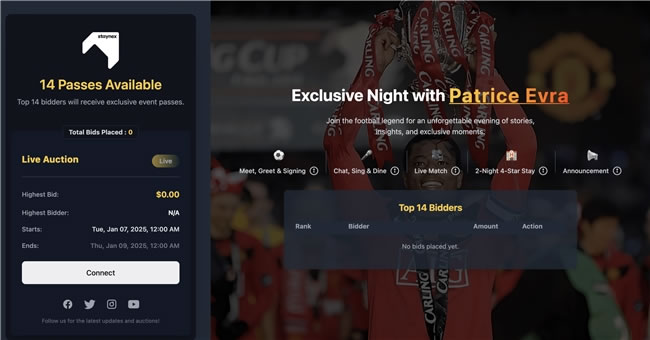 此外,活動現(xiàn)場將見證 STAYNEX 與 Patrice Evra 的簽約儀式,并獲取精美禮品、幸運(yùn)抽獎和獨(dú)家優(yōu)惠。具體相關(guān)權(quán)益或競拍鏈接以及競拍教程請查看STAYNEX.VIP 官方說明。