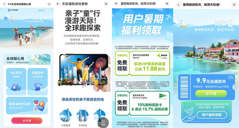暑期,天際通為計劃出境游的用戶特別推出了“全球隨心用”活動,境外流量9.9元包天,每天有5GB高速流量,活動覆蓋港澳、新馬泰、日韓、歐洲、澳大利亞、美國(本土地區(qū))等50個國家地區(qū),多重優(yōu)惠讓境外出行更劃算。華為天際通還為出行亞洲、歐洲的用戶提供了多地旅游優(yōu)惠權(quán)益,涵蓋機(jī)票酒店、旅游景點、吃喝玩樂等各個方面,更多精彩等你來發(fā)現(xiàn)!