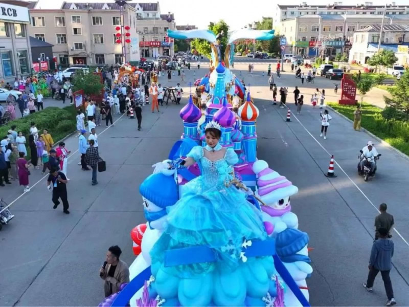 “冰雪綺夢(mèng)花車(chē)”,巧妙融合了伊春作為“紅松故鄉(xiāng)”的生態(tài)特色與對(duì)俄開(kāi)放的地緣優(yōu)勢(shì)。銀裝素裹的紅松林展現(xiàn)北國(guó)冰雪魅力,俄羅斯城堡造型呼應(yīng)伊春作為中俄邊境城市的開(kāi)放姿態(tài)。雪人點(diǎn)綴其間營(yíng)造歡樂(lè)氛圍,底部藍(lán)色水系裝飾象征黑龍江流域的聯(lián)通作用;ㄜ(chē)通過(guò)冰雪童話場(chǎng)景,既展示了伊春冬季旅游的獨(dú)特吸引力,更傳遞出“以冰雪為媒,促開(kāi)放合作”的發(fā)展理念,生動(dòng)詮釋了伊春立足生態(tài)優(yōu)勢(shì)、深化對(duì)外合作、推動(dòng)高質(zhì)量發(fā)展的戰(zhàn)略方向,誠(chéng)邀八方賓客共赴冰雪之約、共享開(kāi)放機(jī)遇。