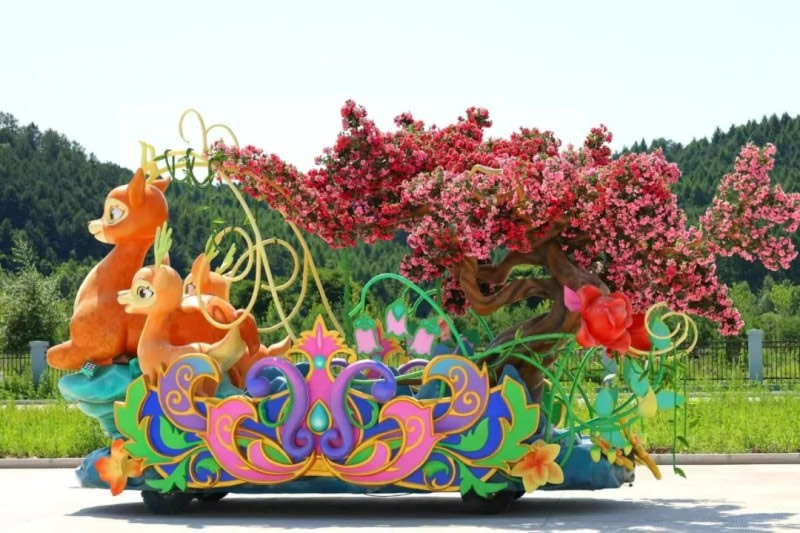 “鹿逐花夢(mèng)花車(chē)”,巧妙融合了小興安嶺獨(dú)特的自然景觀與生物多樣性。車(chē)頭三只靈動(dòng)的小鹿象征著伊春“中國(guó)鹿鄉(xiāng)”的美譽(yù),與九峰山、金山鹿苑等標(biāo)志性景觀交相輝映。盛開(kāi)的杜鵑、百合和冰凌花點(diǎn)綴其間,展現(xiàn)伊春四季分明的生態(tài)特色;ㄜ(chē)通過(guò)森林古樹(shù)與野生動(dòng)物的和諧共生場(chǎng)景,生動(dòng)詮釋了伊春“生態(tài)立市”的發(fā)展理念,既彰顯了“中國(guó)林都”豐富的自然資源,又傳遞出人與自然和諧共處的生態(tài)文明思想,讓觀眾在夢(mèng)幻的森林之旅中感受生態(tài)保護(hù)的深遠(yuǎn)意義。