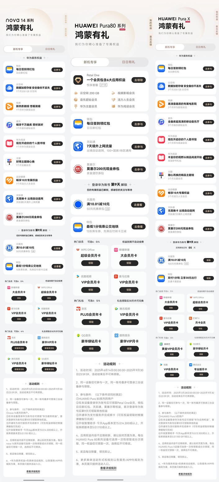 暑期,華為“負一屏”還上線了“鴻蒙有禮”權益禮包,覆蓋影視娛樂、旅行交通、外賣餐飲等多重場景,為用戶帶來更便捷、更優(yōu)惠、更智慧的暑期生活服務。購買Pura X、nova 14系列及Pura 80的新用戶還有額外的“新機專享”禮包。喚醒小藝說:“幫我領鴻蒙有禮”也能跳轉領取。