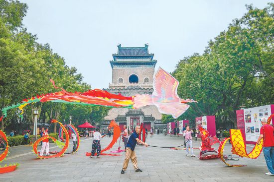 古老的鐘樓前,市民舞動龍鳳彩帶健身休閑,傳統(tǒng)韻味與現(xiàn)代活力在此交融。 本報(bào)記者 武亦彬攝