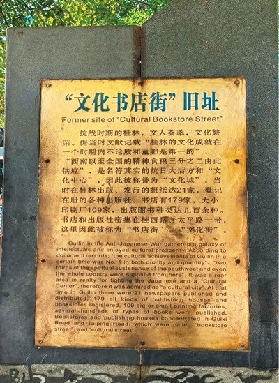 位于桂林市中心的解放西街,一座“文化書店街”舊址紀(jì)念碑在街角靜靜矗立?箲(zhàn)時期,這條街道曾有過另一個名字:桂西路。