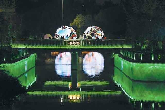 觀瀾橋上,燈光藝術(shù)裝置美輪美奐。 本報(bào)記者 程功攝