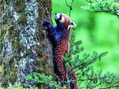 正在攀爬冷杉的小熊貓。本報(bào)記者 周夢爽攝