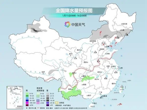 后天,新疆北部和西南部、西藏西部、黑龍江北部、四川西部等地部分地區(qū)有小到中雪或雨夾雪,其中,新疆沿天山地區(qū)和伊犁河谷等地部分地區(qū)有大雪或暴雪。湖北中南部、湖南西部和北部、重慶、貴州、廣西北部、云南南部等地部分地區(qū)有小到中雨。