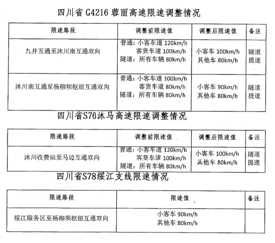 G4216蓉麗高速沐川南互通至楊柳壩樞紐互通雙向限速調(diào)整。調(diào)整前,小客車道限速每小時(shí)100公里,客貨車道限速每小時(shí)80公里,隧道內(nèi)所有車輛限速每小時(shí)80公里。調(diào)整后,全路段(包括隧道)小客車限速每小時(shí)90公里,其他車輛限速每小時(shí)80公里。