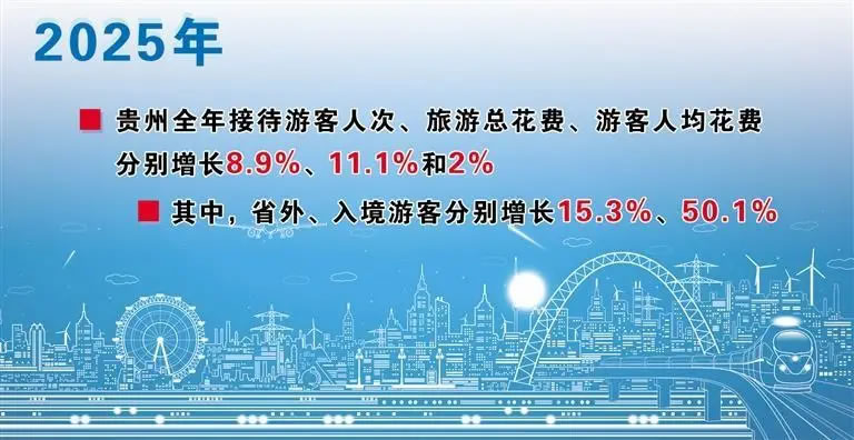 文旅市場的火熱,讓越來越多經(jīng)營主體不斷跨界營業(yè),在文旅行業(yè)創(chuàng)新前進(jìn),與傳統(tǒng)旅游經(jīng)營主體一起推動貴州旅游高質(zhì)量發(fā)展。日前,記者從貴州省2025年經(jīng)濟(jì)運(yùn)行情況新聞發(fā)布會獲悉,2025年貴州全年接待游客人次、旅游總花費(fèi)比上年分別增長8.9%、11.1%。另據(jù)省文旅廳數(shù)據(jù),省外、入境游客分別增長了15.3%、50.1%。