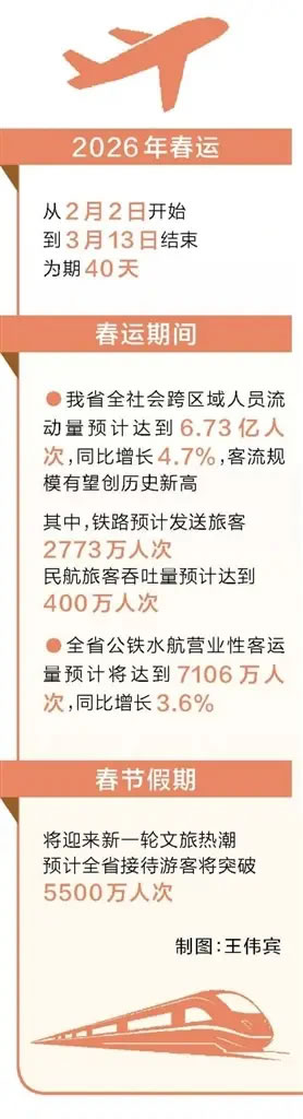 2026年春運(yùn)從2月2日開(kāi)始,到3月13日結(jié)束,為期40天。今年春節(jié)是個(gè)“大年”,共有9天假期,預(yù)計(jì)群眾返鄉(xiāng)、探親、旅游的出行意愿將更加強(qiáng)烈。春運(yùn)期間,預(yù)計(jì)我省全社會(huì)跨區(qū)域人員流動(dòng)量達(dá)到6.73億人次,同比增長(zhǎng)4.7%,客流規(guī)模有望創(chuàng)歷史新高,其中鐵路預(yù)計(jì)發(fā)送旅客2773萬(wàn)人次,民航旅客吞吐量預(yù)計(jì)達(dá)到400萬(wàn)人次。