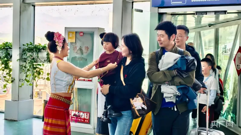 西雙版納機(jī)場工作人員為到達(dá)旅客送上香囊(央廣網(wǎng)發(fā) 西雙版納機(jī)場供圖)