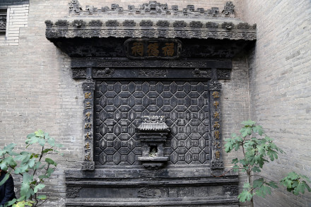 喬家大院大門坐西向東,為拱形門洞,上有高大的頂樓,頂樓正中懸掛著山西巡撫受慈禧太后面喻而贈送的匾額,上書“福種瑯環(huán)”四個大字。黑漆大門扇上裝有一對椒圖獸街大銅環(huán),并鑲嵌著銅底板對聯(lián)一付:“子孫賢,族將大;兄弟睦,家之肥。”字里行間透露著喬在中堂主人的希望和追求,也許正是遵循這樣的治家之道,喬在中堂經過連續(xù)幾代人的努力,達到了后來人丁興旺、家資萬貫的輝煌。大門頂端正中嵌青石一塊,上書“古風”。大門對面的掩壁上,刻有磚雕“百壽圖”,一字一個樣,字字有風采。百壽圖為“在中堂”主人喬致庸的孫婿、近代著名學者、篆書家常贊春書寫。掩壁兩旁是清朝大臣左宗棠題贈的一付意味深長的篆體楹聯(lián):“損人欲以復天理,蓄道德而能文章!遍侯~是“履和”。甬道的西盡頭處是雕龍畫棟的喬氏祠堂,與大門遙相對應。祠堂裝點得十分講究,三級臺階,廟宇結構,以獅子頭柱,漢白玉石雕,壽字扶欄,通天欞門木雕夾扇。出檐以四條柱子承頂,柱頭有玉樹交榮、蘭馨桂馥、藤羅繞松的鏤空木雕。額頭有匾,上書“仁周義溥”四字,李鴻章所題。祠堂里原陳列著木刻精雕的三層祖先牌位。