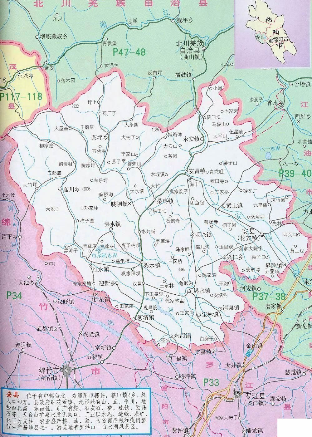 安縣位于四川盆地西北部,距成都110公里,距綿陽科技城10公里?h境山丘壩兼有,幅員1404平方公里。總?cè)丝?0萬人,轄4鄉(xiāng)16鎮(zhèn)。安縣氣候宜人,生態(tài)環(huán)境優(yōu)美。屬亞熱帶濕潤季風(fēng)氣候,氣候溫和,雨量充沛,四季分明,日照充足,無霜期長。年均氣溫16.3℃,年均降水量1260mm,空氣質(zhì)量常年達(dá)國家二級(jí)標(biāo)準(zhǔn),森林覆蓋率達(dá)42%?h內(nèi)交通四通八達(dá),人流、物流進(jìn)出快捷方便 ,現(xiàn)代通訊覆蓋全縣,并開通了ADSL業(yè)務(wù)和高速寬帶網(wǎng)絡(luò),光纖有線電視遍布城鄉(xiāng)。自然資源豐富,有水泥石灰石、磷礦、煤、硫鐵礦、重晶石、鋁土礦等礦產(chǎn)資源29種,儲(chǔ)量豐富;有動(dòng)物資源948種,其中大熊貓、金絲猴等國家一、二級(jí)保護(hù)動(dòng)物77種;有植物資源814種,其中銀杏、珙桐等國家一級(jí)珍稀植物及棗皮、杜仲、烏藥等中藥材資源100多種。工業(yè)基礎(chǔ)良好。電子、建材輕化、能源、化工、食品等支柱工業(yè)日益壯大。農(nóng)業(yè)生產(chǎn)條件優(yōu)越,農(nóng)村經(jīng)濟(jì)持續(xù)發(fā)展。雜交水稻制種、優(yōu)質(zhì)水稻、無公害蔬菜、水果、無規(guī)定疫病畜禽養(yǎng)殖、水產(chǎn)、蠶桑、魔芋、棗皮等農(nóng)業(yè)產(chǎn)業(yè)化經(jīng)營蓬勃發(fā)展。