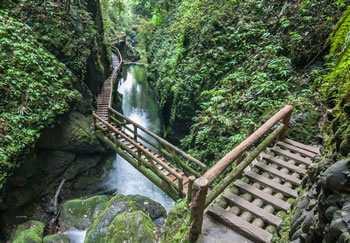 五龍溝古稱蠻河溝,長(zhǎng)約8千米,因傳說古時(shí)有五條神龍隱藏于溝中而得名。其中的景色有金娃娃沱,景色絕佳的龍隱峽棧道,石筍巖,回音壁等。