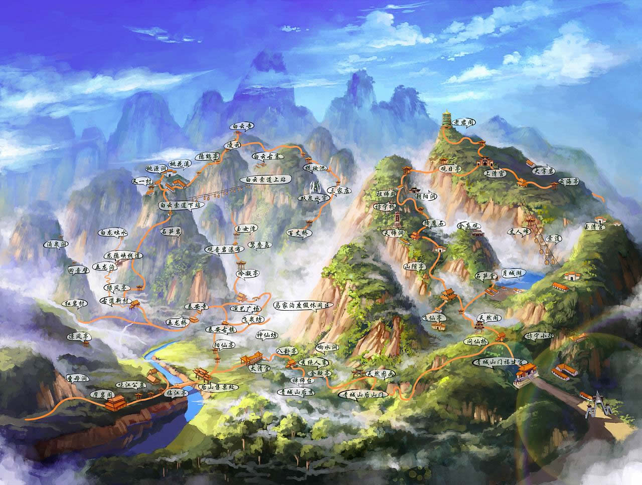青城山分前、后山。前山是青城山風(fēng)景名勝區(qū)的主體部分,約15平方千米,景色優(yōu)美,文物古跡眾多,主要景點(diǎn)有建福宮、天然圖畫、天師洞、朝陽洞、祖師殿、上清宮等;后山總面積100平方千米,水秀、林幽、山雄,高不可攀,直上而去,冬天則寒氣逼人、夏天則涼爽無比,主要景點(diǎn)有金壁天倉、圣母洞、山泉霧潭、白云群洞、天橋奇景等。