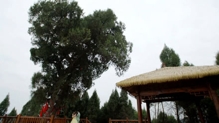 民間關于神仙樹的美麗傳說很多,相傳某年的八月八日,不知何方的一高一矮,一胖一瘦,一位仙風道骨,一位邋遢放浪的老者,飄然來到尖包嶺,點石為枰,碎石為棋,以石為凳,手談對弈。棋勢變幻之間,四周時而雷霆激蕩,時而風和日麗,時而萬物沉寂。這樣,不知過了多少時候,兩位老者抹掉棋枰,拂去棋子,背北面南,嘴里念念有詞,手里比比劃劃,頃刻間,尖包嶺大雨傾盆,繼而和風細雨,云蒸霞蔚,兩位老者飄然而去,所坐之地變成了五花石,形如花瓣的五花石中間長出兩棵高低錯落、枝繁葉茂的翠柏。從此,人們就把翠柏叫作“神仙樹”,把 “尖包嶺”叫作“神仙梁”。又有民間記載:仙海湖所在沉香鋪(現(xiàn)名沉抗鎮(zhèn))是民間傳說《寶蓮燈》中三圣母之子沉香生長和得道升仙的地方。據(jù)《廣異記》載:沉香大孝,其母被二郎神楊戩壓于華山之下,沉香以神、斧打敗二郎神,劈山救母,而神仙樹就是沉香仙子母子二人化身而來的兩株古樹,交織相連,撐天而起,屹立山巔,母子倆以深情目光,凝視著天下樹,庇護這天下蒼生。