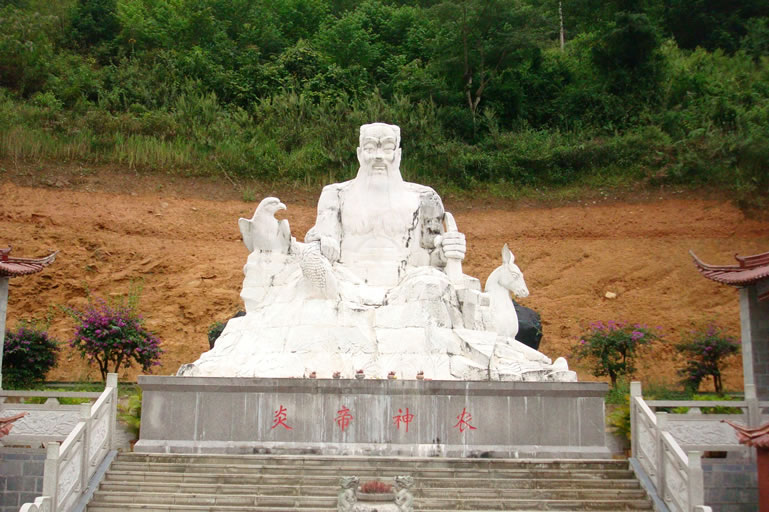 神農(nóng)祠:位于雙江自治縣勐庫鎮(zhèn)北部南勐河上游,勐庫大雪山萬畝野生古茶樹群落山腳的古茶谷中心地帶。祠內(nèi)塑有一尊采用雪花白石雕制而成的炎帝神農(nóng)塑像,高9.5米,基座9米,寬4米。對稱建有兩間傳統(tǒng)民族風(fēng)格房屋,左為茶展館(以茶之源、茶之魂、茶之歌三個方面用54張圖片展示雙江勐庫大葉茶原生地形象和茶葉產(chǎn)業(yè)發(fā)展情況),右為茶藝館(在墻體上精心制作一幅反映雙江拉祜族、佤族、布朗族、傣族飲茶習(xí)俗為主的壁畫,高2米,長13.8米)。塑像基座四周及中心廣場共鋪貼大理青石板530.9平方米,從神農(nóng)祠牌坊至炎帝神農(nóng)塑像共有69級臺階。